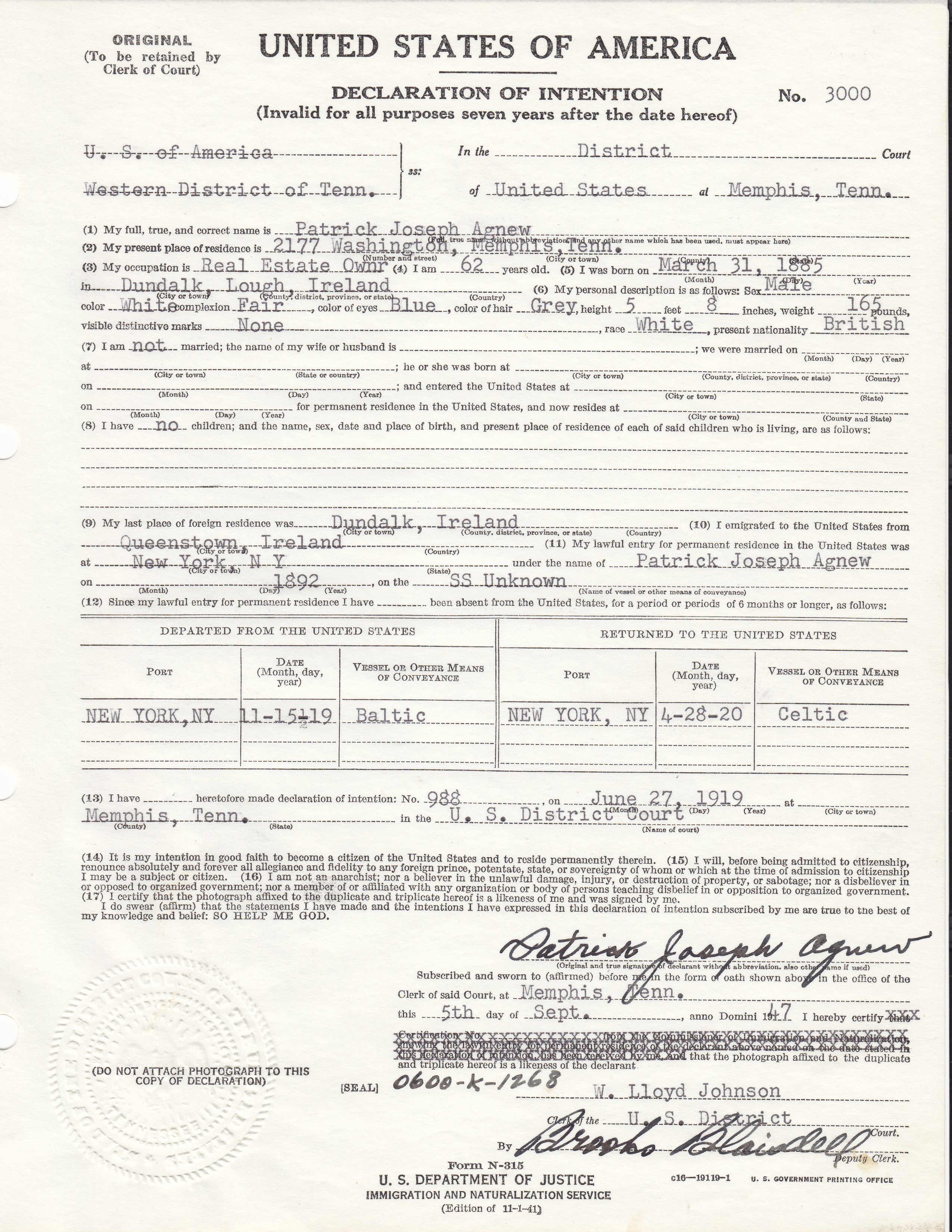 | Agnew | Patrick Joseph | D | 3000 | . | 1 | . | |